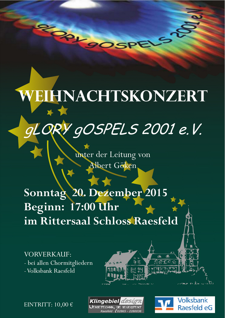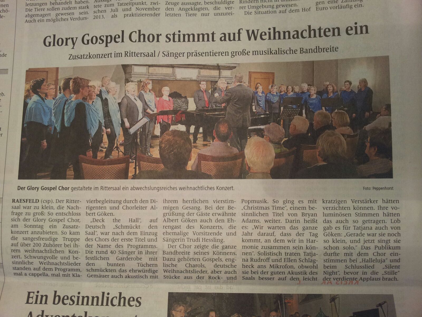 Unser diesjähriges Weihnachtskonzert mit schwungvollen und besinnlichen Weihnachtsliedern haben wir diesmal im Rittersaal des Schloss Raesfeld gegeben. Dieses Jahr war die Nachfrage so groß, dass wir sogar ein Zusatzkonzert – sozusagen als Spätvorstellung – gegeben haben.