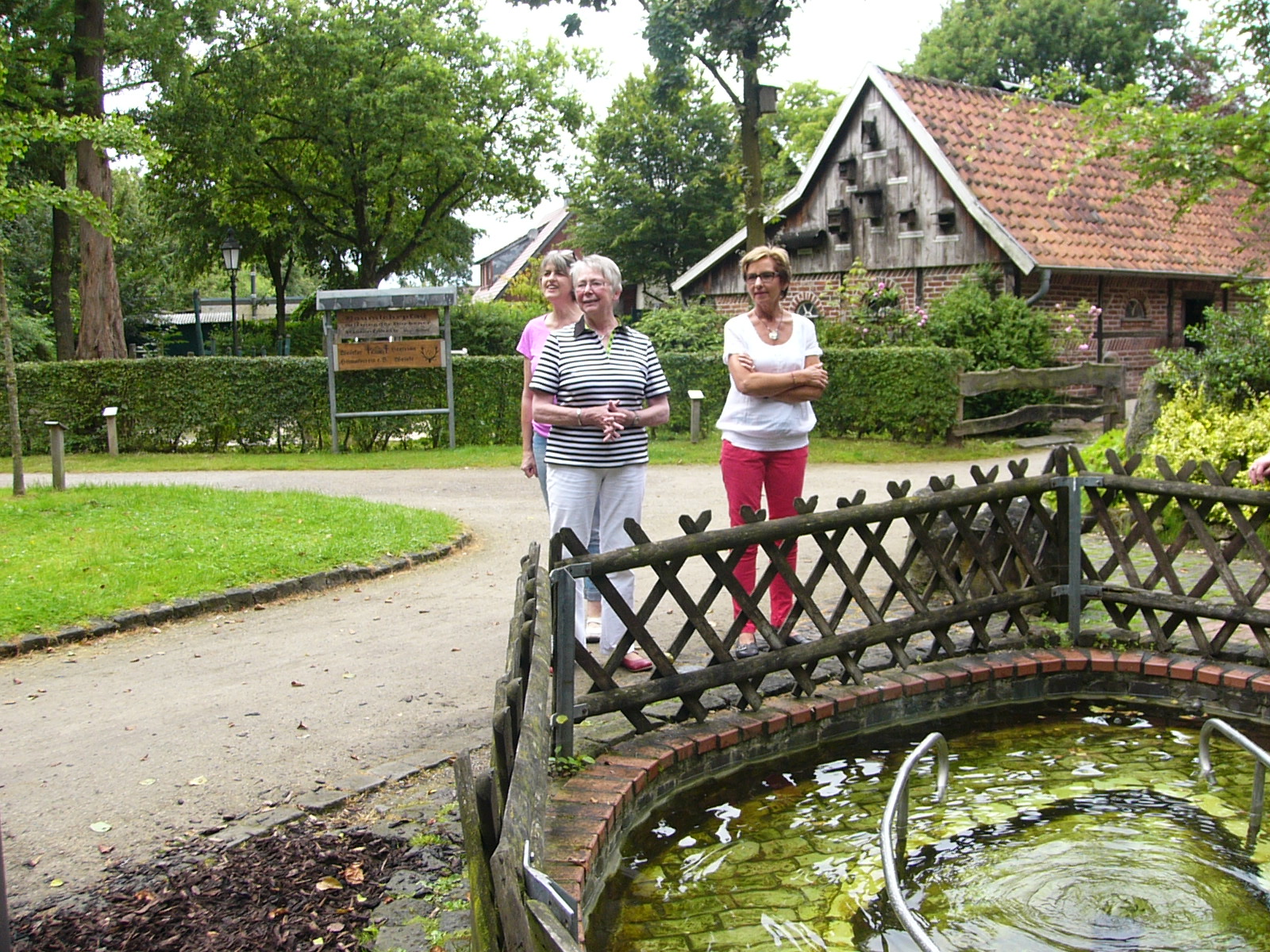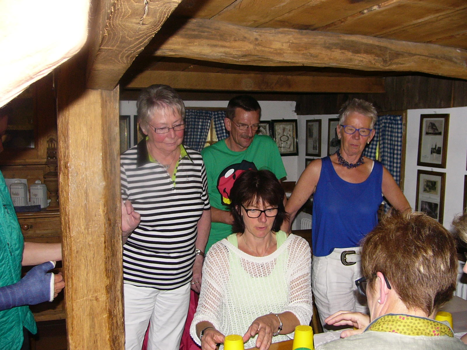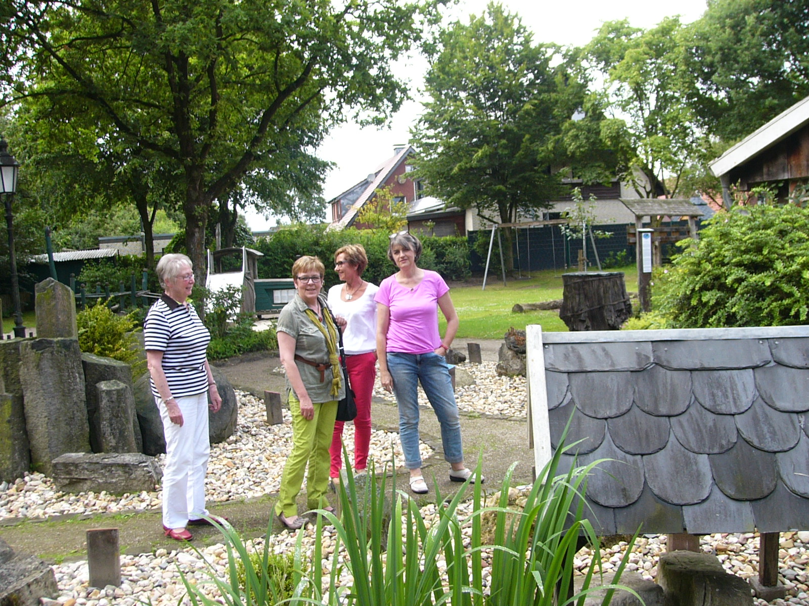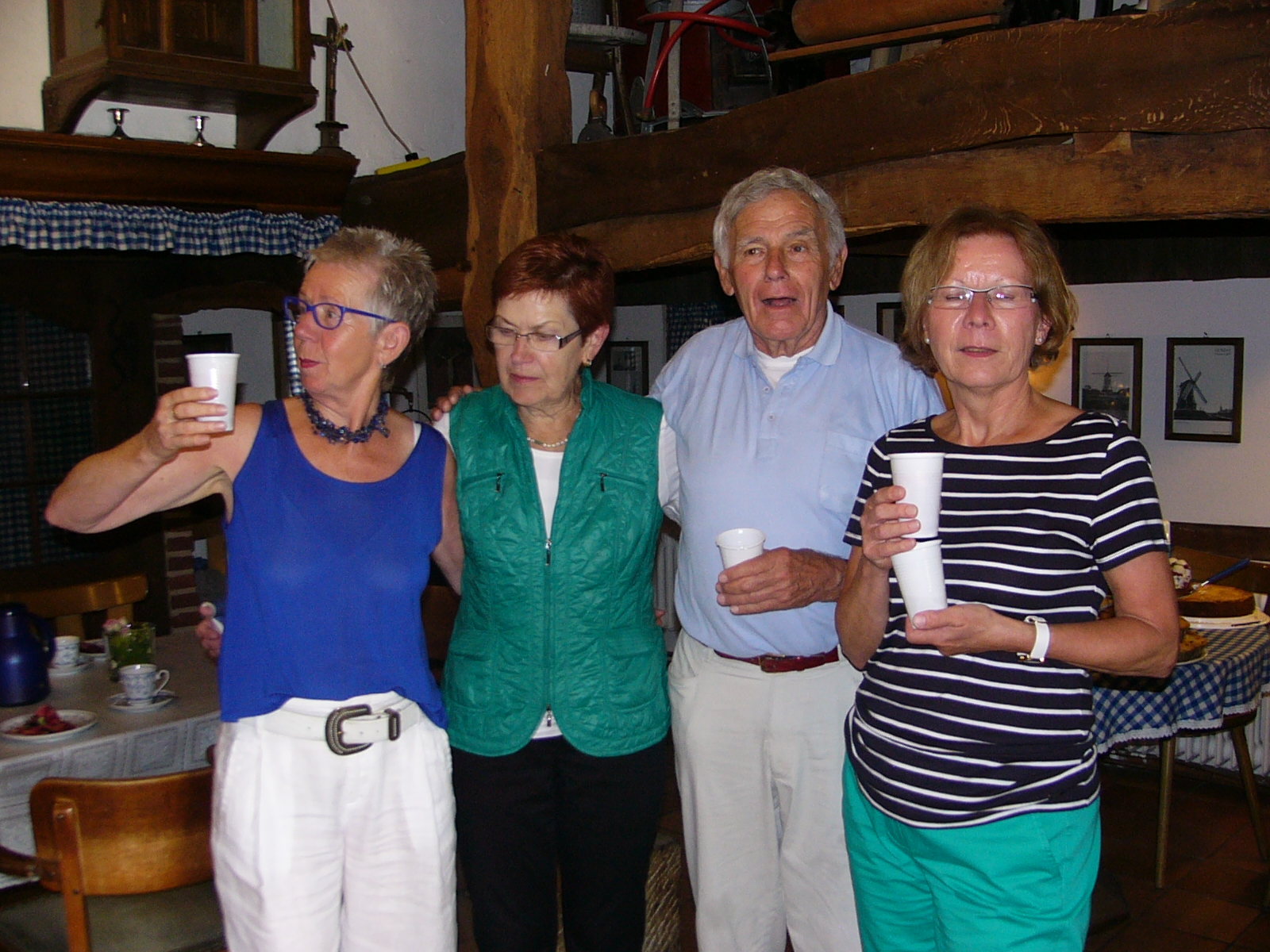 Nach dem Kaffee trinken, erkundeten wir die gesammte Anlage – „Heimathaus Weseke“, als da waren: der Apotherkergarten, der Kräutergarten, der Steingarten mit Sanden und Steinen aus aller Welt, die ausgestellten und liebevoll restaurierten, antiken landwirtschaftlichen Geräte. Einige liessen es sich nicht nehmen, auf „Kneippschen“ Wegen zu wandeln und das Wassertretbecken zu durchwaten – natürlich im Storchengang. Nach der Erkundung des Geländes, fanden sich alle Teilnehmer wieder im Heimathaus ein, um zu klönen oder ihr Geschick, bei vorbereiteten Spielen unter Beweis zu stellen. Wie es sich für einen Chor gehört, kam natürlich das gemeinsame Singen auch nicht zu kurz, wobei wir von Ingrid Garbert, auf der Gitarre begleitet wurden. Während des Festes, konnte ein jeder ein paar nette Worte in ein spezieell vorbereitetes Album eintragen, welches unserem scheidenden Sangesbruder, Friedhelm, bei der 1. Probe nach den Sommerferien überreicht wurde. Zum Abschluss sangen wir gemeinsam a`capella: Hallelujah, Jesus on the mainline und Can`t help falling in love.