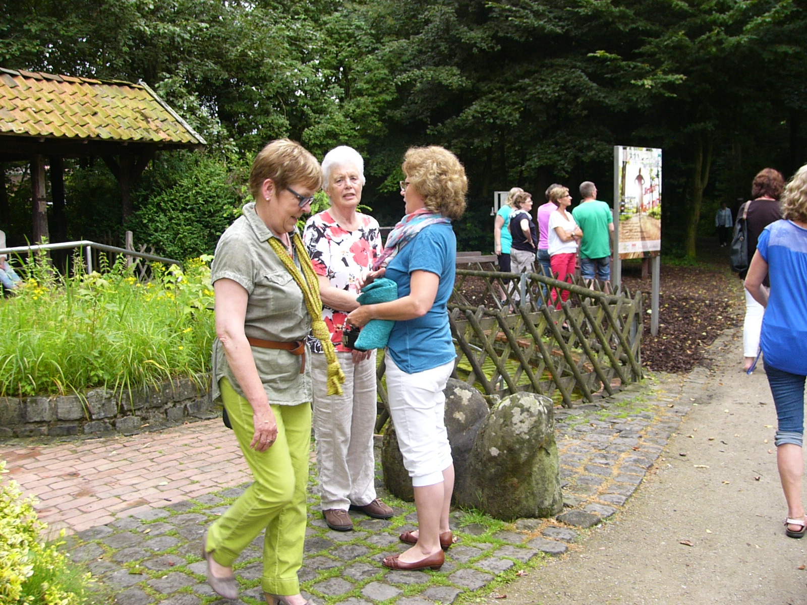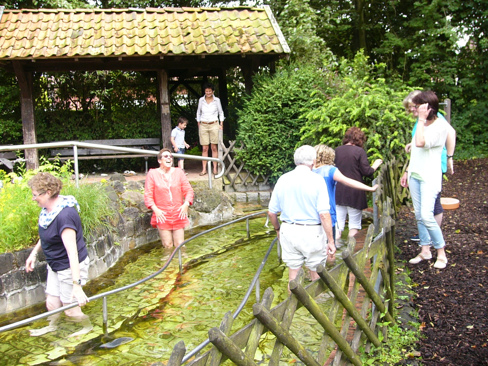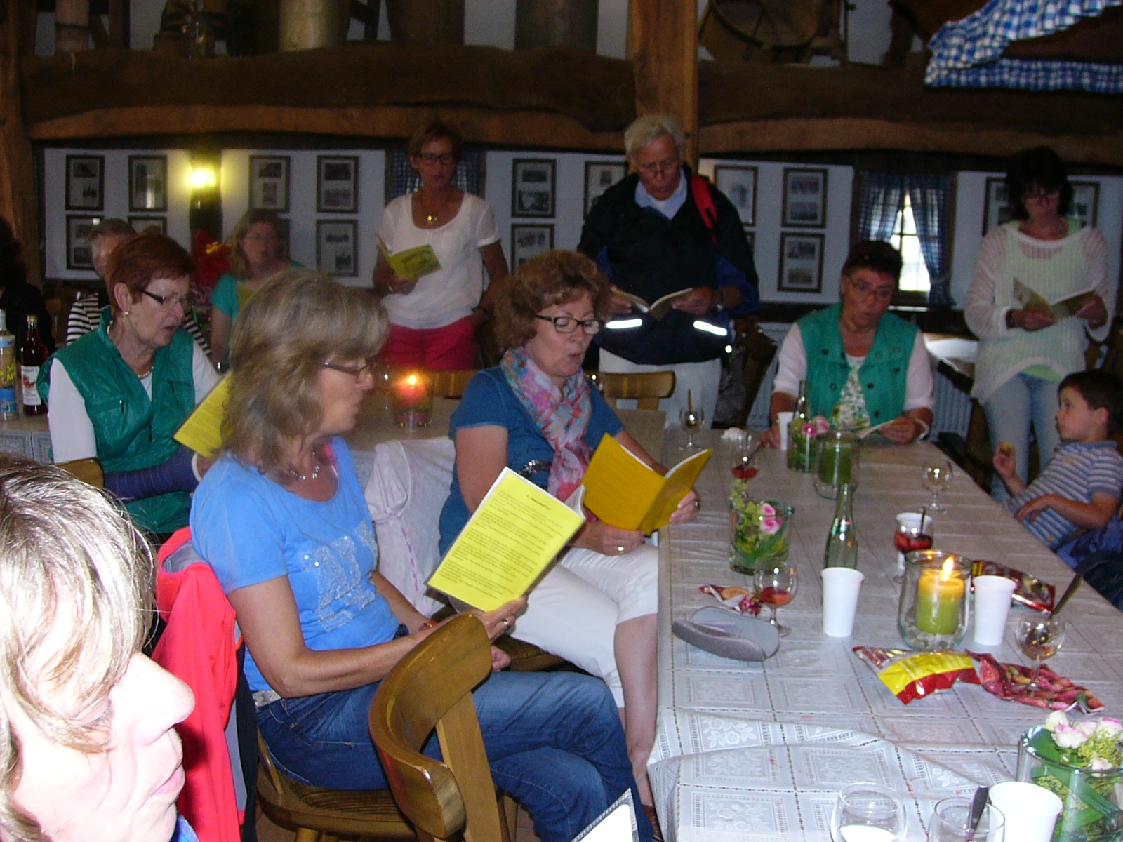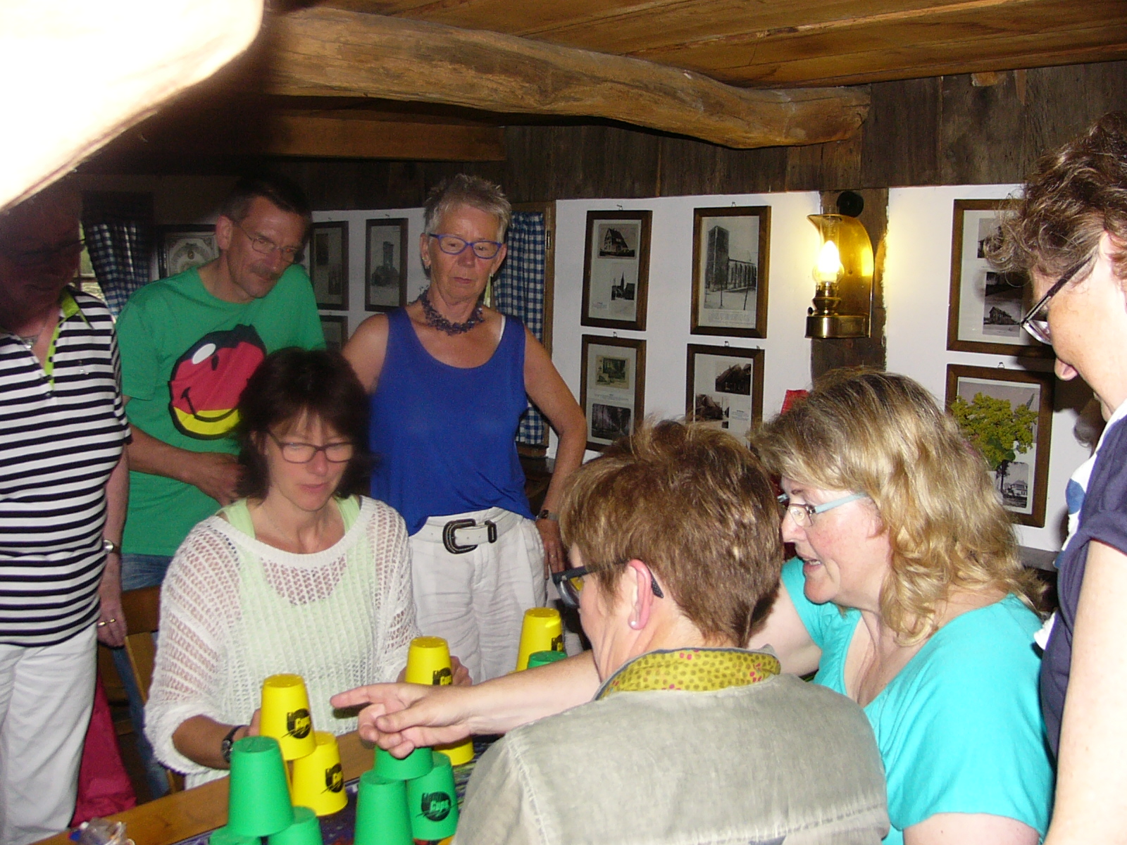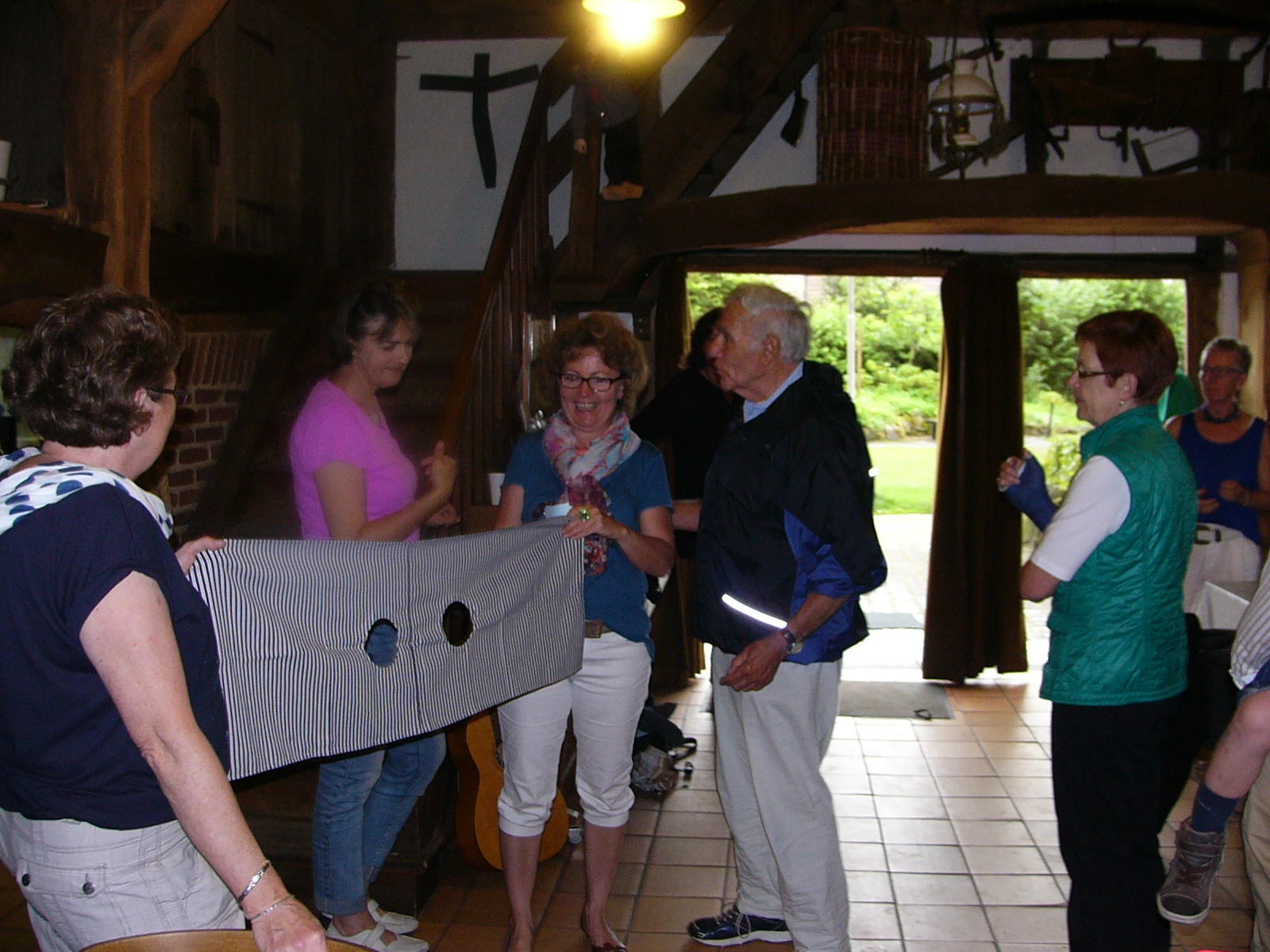 Nach dem Kaffee trinken, erkundeten wir die gesammte Anlage – „Heimathaus Weseke“, als da waren: der Apotherkergarten, der Kräutergarten, der Steingarten mit Sanden und Steinen aus aller Welt, die ausgestellten und liebevoll restaurierten, antiken landwirtschaftlichen Geräte. Einige liessen es sich nicht nehmen, auf „Kneippschen“ Wegen zu wandeln und das Wassertretbecken zu durchwaten – natürlich im Storchengang. Nach der Erkundung des Geländes, fanden sich alle Teilnehmer wieder im Heimathaus ein, um zu klönen oder ihr Geschick, bei vorbereiteten Spielen unter Beweis zu stellen. Wie es sich für einen Chor gehört, kam natürlich das gemeinsame Singen auch nicht zu kurz, wobei wir von Ingrid Garbert, auf der Gitarre begleitet wurden. Während des Festes, konnte ein jeder ein paar nette Worte in ein spezieell vorbereitetes Album eintragen, welches unserem scheidenden Sangesbruder, Friedhelm, bei der 1. Probe nach den Sommerferien überreicht wurde. Zum Abschluss sangen wir gemeinsam a`capella: Hallelujah, Jesus on the mainline und Can`t help falling in love.