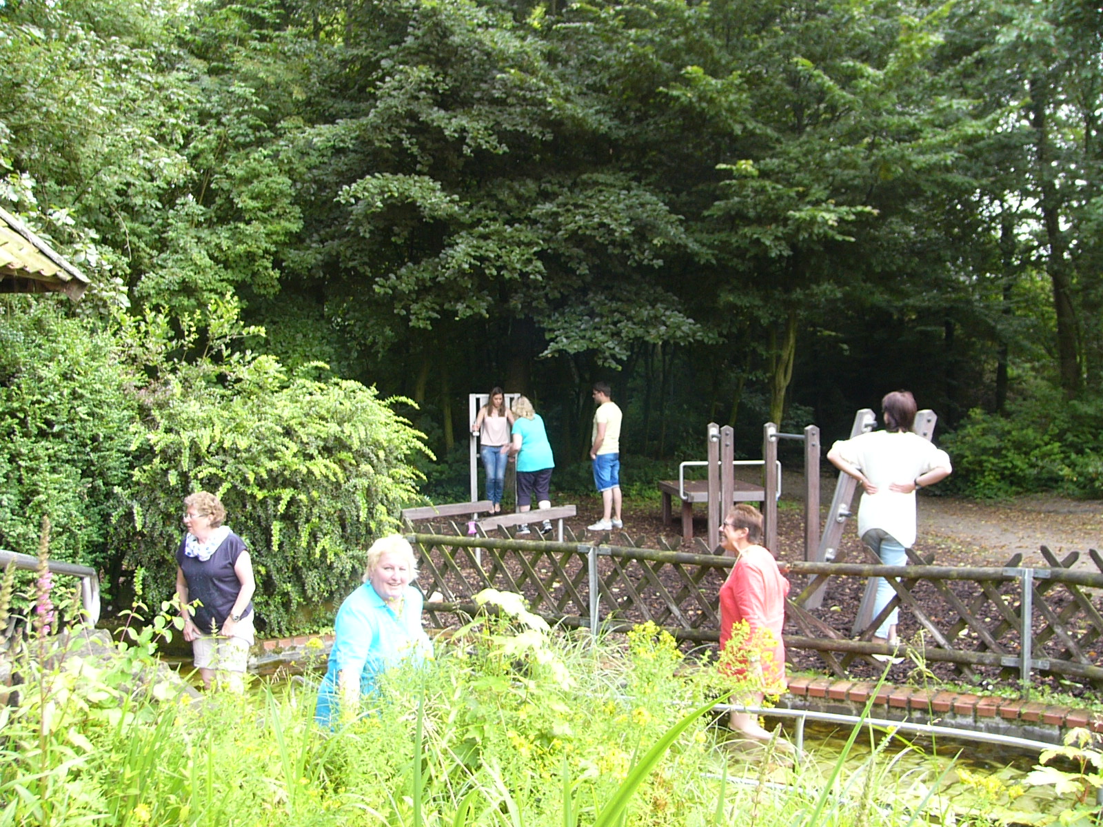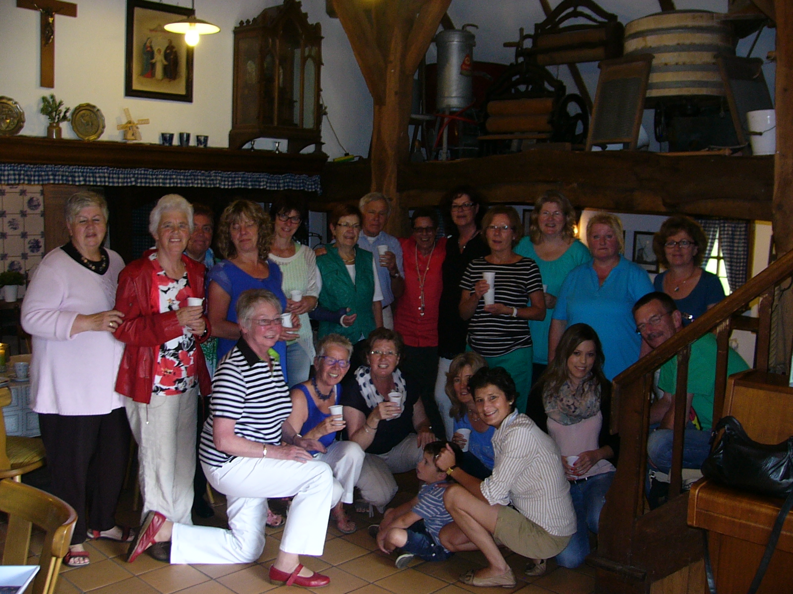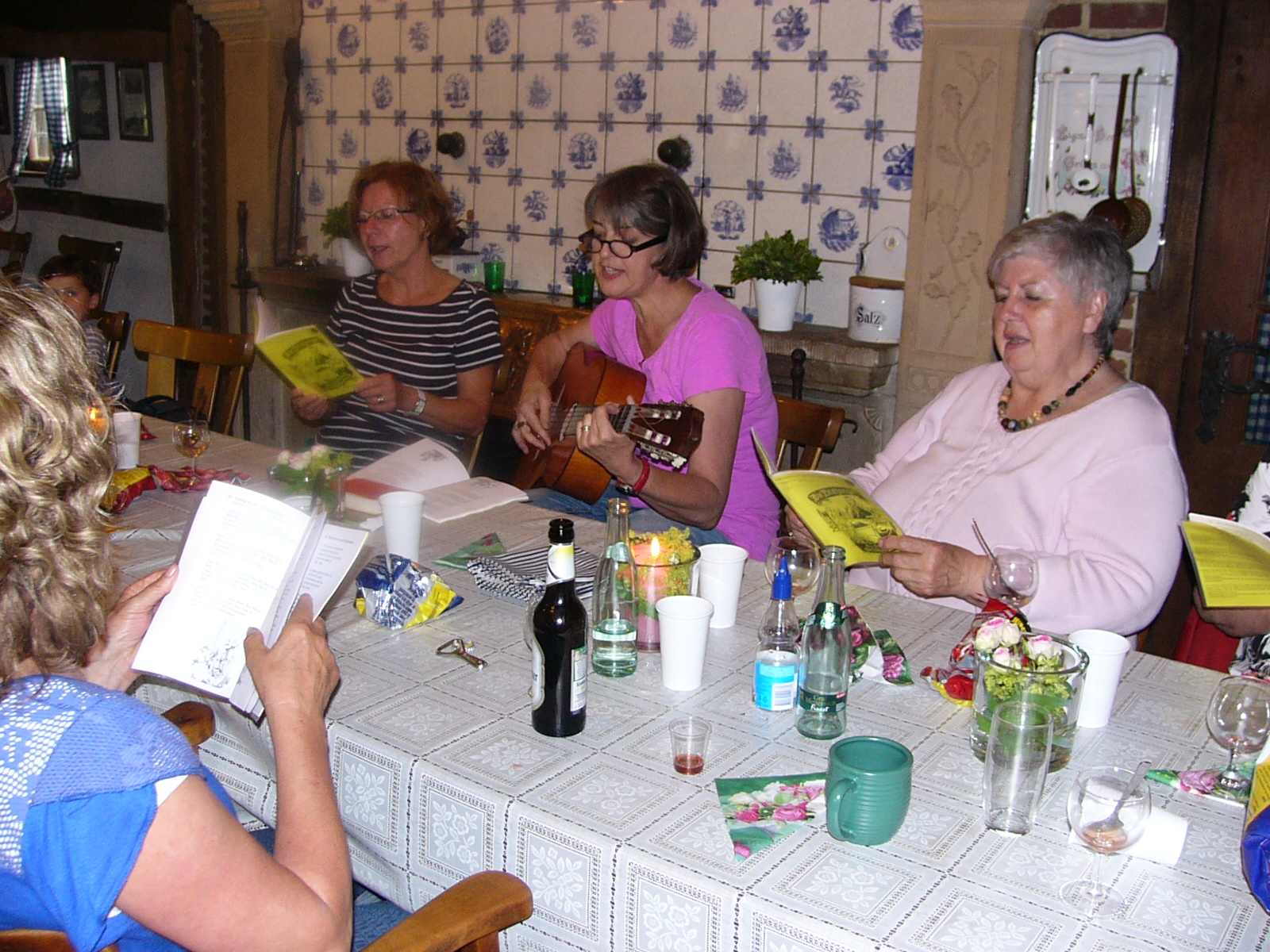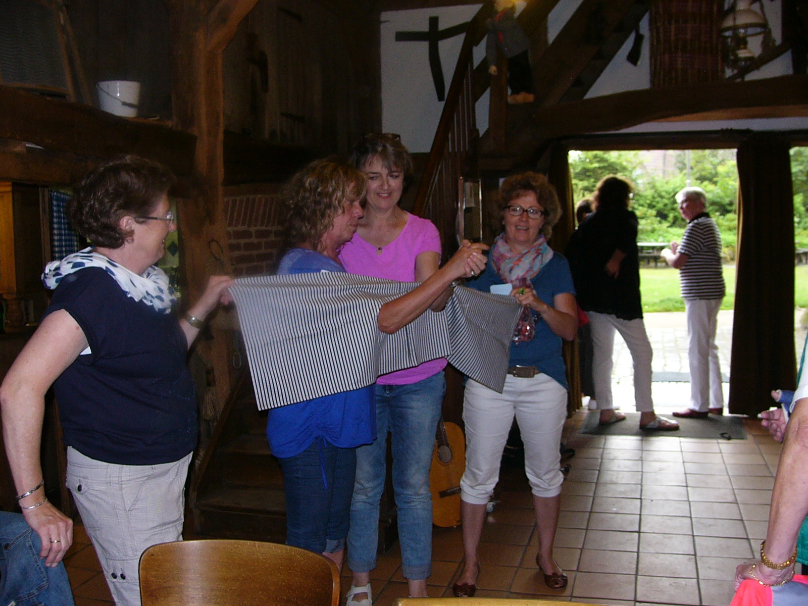 Nach dem Kaffee trinken, erkundeten wir die gesammte Anlage – „Heimathaus Weseke“, als da waren: der Apotherkergarten, der Kräutergarten, der Steingarten mit Sanden und Steinen aus aller Welt, die ausgestellten und liebevoll restaurierten, antiken landwirtschaftlichen Geräte. Einige liessen es sich nicht nehmen, auf „Kneippschen“ Wegen zu wandeln und das Wassertretbecken zu durchwaten – natürlich im Storchengang. Nach der Erkundung des Geländes, fanden sich alle Teilnehmer wieder im Heimathaus ein, um zu klönen oder ihr Geschick, bei vorbereiteten Spielen unter Beweis zu stellen. Wie es sich für einen Chor gehört, kam natürlich das gemeinsame Singen auch nicht zu kurz, wobei wir von Ingrid Garbert, auf der Gitarre begleitet wurden. Während des Festes, konnte ein jeder ein paar nette Worte in ein spezieell vorbereitetes Album eintragen, welches unserem scheidenden Sangesbruder, Friedhelm, bei der 1. Probe nach den Sommerferien überreicht wurde. Zum Abschluss sangen wir gemeinsam a`capella: Hallelujah, Jesus on the mainline und Can`t help falling in love.